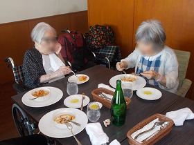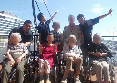 食後に猛暑日でしたがテラスへ出て、ヨットを背景に集合写真を撮りました。