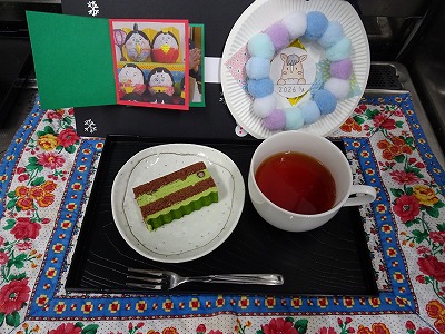 抹茶のケーキと紅茶を召し上がっていただきました。