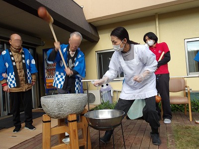 今日は晴天。法被を着こんで杵を手に、いざ餅つき開始!