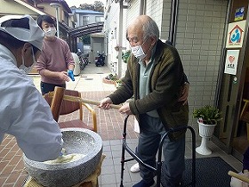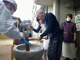 今年の餅つきは 12月12日の午前中のみでしたので残念ながら、数名のみのご利用者の参加になりました。