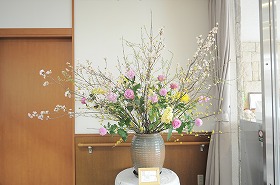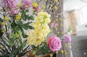 ピンク色と黄色がメインの春らしいアレンジメントを活けてくださいました。