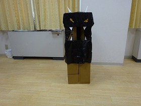 黒い鬼の口に新聞紙で作った豆を入れるゲームです!!