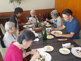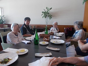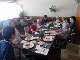 食後に猛暑日でしたがテラスへ出て、ヨットを背景に集合写真を撮りました。