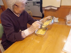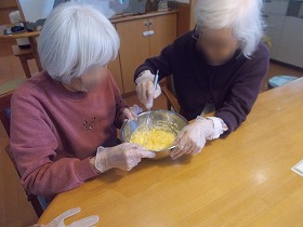 ボウルに卵を割って、生地はご入居者と「一緒に混ぜましょう」と協力し、