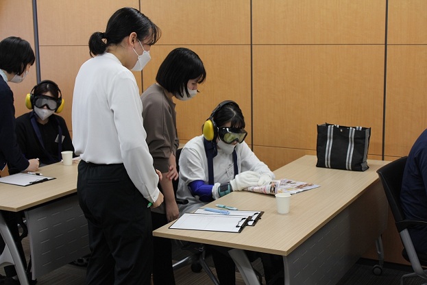 ※インスタントシニア体験とは、高齢者の身体機能や心理的変化を、白内障用ゴーグルやおもりなどの器具を装着して一時的に体験するものです。